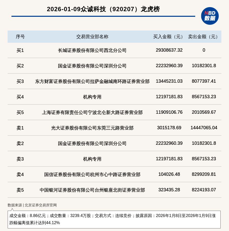 (记者 曾健辉) 免责声明:本文内容与数据仅供参考,不构成投资建议,使用前核实。据此操作,风险自担。 每日经济新闻 每经讯,2026年1月9日,北交所上市公司众诚科技(920207,收盘价:32元)登上龙虎榜,交易方式是连续竞价,披露原因是 2026年1月8日至2026年1月9日涨跌幅偏离值累计达到44.12%,成交数量3239.4万股,成交金额8.86亿元。买一席位为长城证券股 份有限公司西北分公司,买入2930.86万元;卖一席位为光大证券股份有限公司东莞三元路营业部,卖出1444.71万元。 | | 2026-01-09众诚科技 (920207) 龙虎榜 | | | | --- | --- | --- | --- | | 序号 | 交易营业部名称 | 买入金额(元) | 卖出金额(元) | | न्द्र ग | 长城证券股份有限公司西北分公司 | 29308637.32 | 0 | | 买2 | 国金证券股份有限公司深圳分公司 | 22232960.39 | 10182301.8 | | ग्रें3 | 东方财富证券股份有限公司拉萨金融城南环路证券营业部 | 13445231.03 | 807739 ...