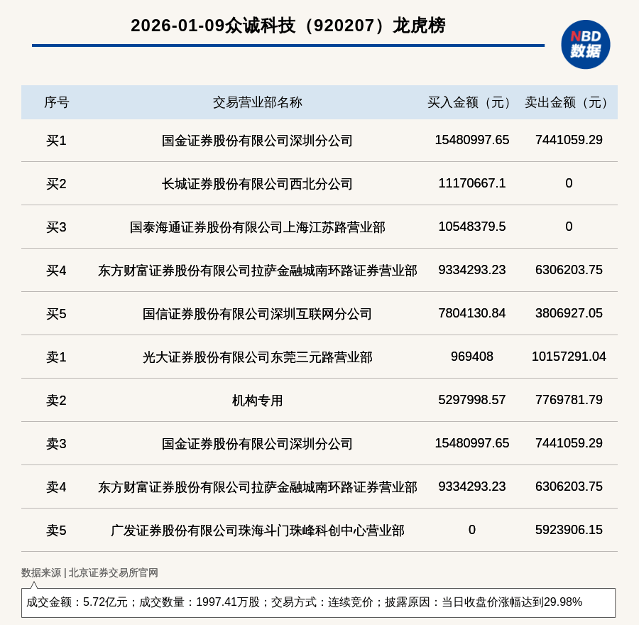每经讯,2026年1月9日,北交所上市公司众诚科技(920207,收盘价:32元)登上龙虎榜,交易方式是连续竞价,披露原因是 当日收盘价涨幅达到29.98%,成交数量1997.41万股,成交金额5.72亿元。买一席位为国金证券股份有限公司深圳分公司,买入 1548.1万元;卖一席位为光大证券股份有限公司东莞三元路营业部,卖出1015.73万元。 | | 2026-01-09众诚科技 (920207) 龙虎榜 | | | | --- | --- | --- | --- | | 序号 | 交易营业部名称 | 买入金额(元) | 卖出金额(元) | | ਜੇਟ ਹ | 国金证券股份有限公司深圳分公司 | 15480997.65 | 7441059.29 | | 买2 | 长城证券股份有限公司西北分公司 | 11170667.1 | 0 | | 买3 | 国泰海通证券股份有限公司上海江苏路营业部 | 10548379.5 | 0 | | 买4 | 东方财富证券股份有限公司拉萨金融城南环路证券营业部 | 9334293.23 | 6306203.75 | | જેટ | 国信证券股份有限公司深圳互联网分公司 | 780 ...