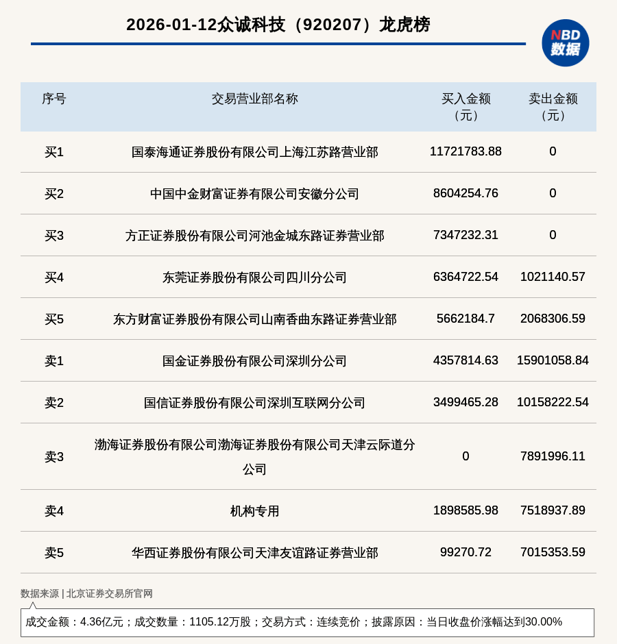 每经讯,2026年1月12日,北交所上市公司众诚科技(920207,收盘价:41.6元)登上龙虎榜,交易方式是连续竞价,披露原因 是当日收盘价涨幅达到30.00%,成交数量1105.12万股,成交金额4.36亿元。买一席位为国泰海通证券股份有限公司上海江苏路 营业部,买入1172.18万元;卖一席位为国金证券股份有限公司深圳分公司,卖出1590.11万元。 | | 2026-01-12分诚科技 (920207) 龙虎榜 | | | | --- | --- | --- | --- | | 序号 | 交易营业部名称 | 买入金额 | 卖出金额 | | | | (元) | (元) | | ポリ | 国泰海通证券股份有限公司上海江苏路营业部 | 11721783.88 | 0 | | 买2 | 中国中金财富证券有限公司安徽分公司 | 8604254.76 | 0 | | न्नें3 | 方正证券股份有限公司河池金城东路证券营业部 | 7347232.31 | 0 | | द्र 4 | 东莞证券股份有限公司四川分公司 | 6364722.54 | 1021140.57 | | ન્નેટ | 东方财富证券股份有限公 ...