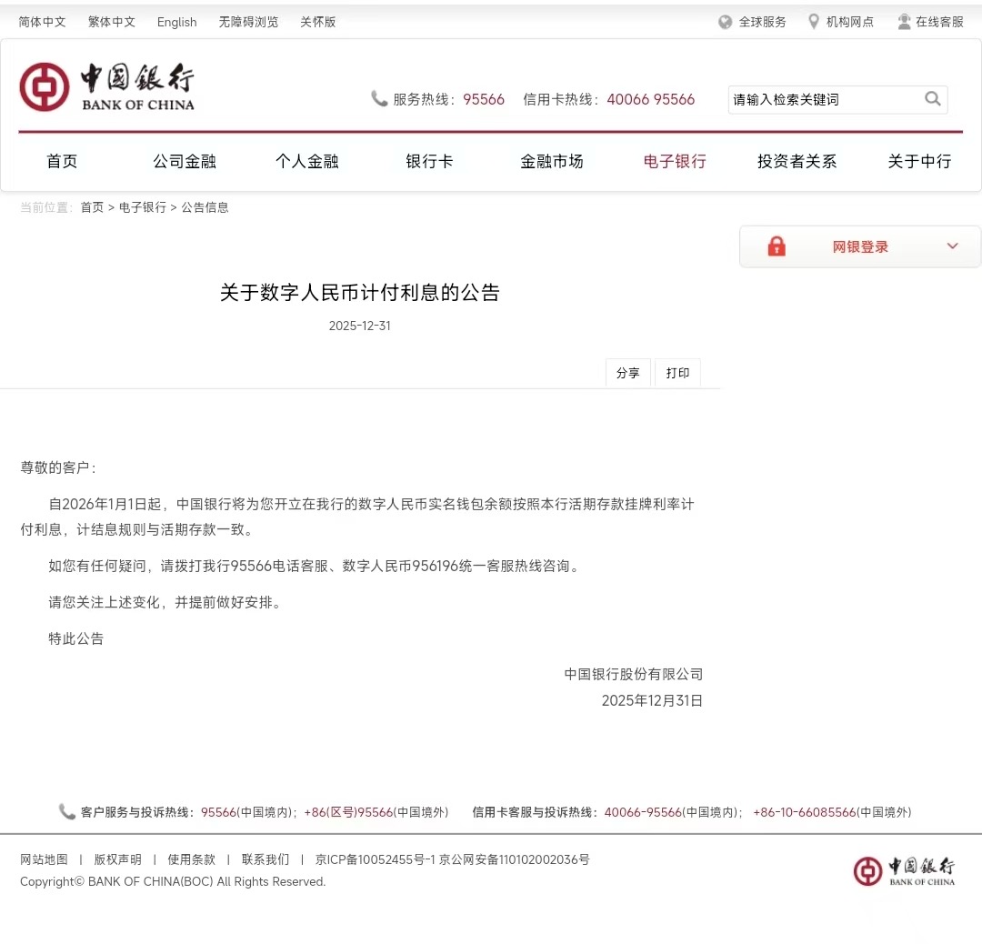 中国银行:2026年起将为数字人民币实名钱包余额计付利息