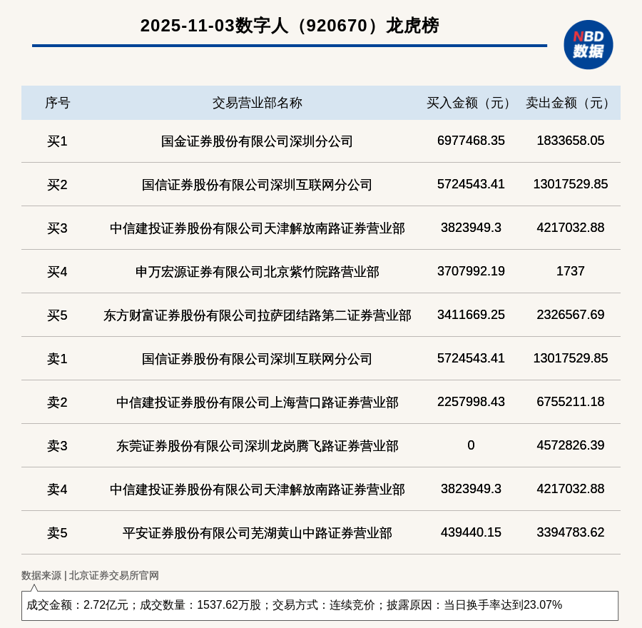 每经讯,2025年11月4日,北交所上市公司数字人(920670,收盘价:19.16元)登上龙虎榜,交易方式是连续竞价,披露原因是 当日换手率达到27.07%,成交数量1804.26万股,成交金额3.21亿元。买一席位为国信证券股份有限公司深圳互联网分公司,买 入1301.74万元;卖一席位为中泰证券股份有限公司淄博分公司,卖出624.86万元。 | | 2025-11-04数字人 (920670) 龙虎榜 | | | | --- | --- | --- | --- | | 序号 | 交易营业部名称 | 买入金额(元) | 卖出金额(元) | | ポリ | 国信证券股份有限公司深圳互联网分公司 | 13017445.55 | 5592508.04 | | 买2 | 国金证券股份有限公司深圳分公司 | 8438475.25 | 2960221.56 | | ग्रेउ | 东方财富证券股份有限公司拉萨团结路第二证券营业部 | 6658764.62 | 2211790.64 | | 买4 | 东方财富证券股份有限公司拉萨团结路第一 证券营业部 | 4548109.86 | 1709965.23 | | ન્નેર ...
