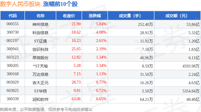| 代码 | 名称 | 收盘价 | 涨跌幅 | 成交量(手) | 成交额(元) | | --- | --- | --- | --- | --- | --- | | 000555 | 神州信息 | 21.90 | 5.04% | 252.40万 | 53.86亿 | | 300730 | 科创信息 | 18.62 | 4.08% | 28.91万 | 5.32 Z | | 002197 | ST证通 | 10.23 | 2.61% | 11.92万 | 1.20亿 | | 300941 | 创识科技 | 25.65 | 2.19% | 7.18万 | 1.83亿 | | 603123 | 學微股份 | 12.82 | 1.34% | 46.96万 | 6.11亿 | | 300205 | *ST天响 | 5.28 | 1.34% | 8.59万 | 4593.98万 | | 300168 | 万达信息 | 7.15 | 1.13% | 31.50万 | 2.24亿 | | 003029 | 吉大正元 | 28.73 | 0.77% | 16.26万 | 4.63亿 | | 603825 | ST华扬 | 9.8 ...