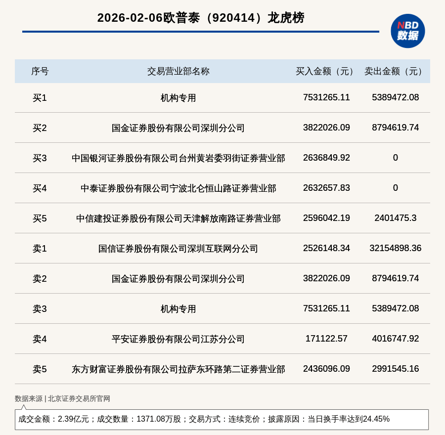 (记者 曾健辉) 免责声明:本文内容与数据仅供参考,不构成投资建议,使用前核实。据此操作,风险自担。 每日经济新闻 每经讯,2026年2月6日,北交所上市公司欧普泰(920414,收盘价:17.28元)登上龙虎榜,交易方式是连续竞价,披露原因是 当日换手率达到24.45%,成交数量1371.08万股,成交金额2.39亿元。买一席位为机构专用,买入753.13万元;卖一席位为国信 证券股份有限公司深圳互联网分公司,卖出3215.49万元。 | | 2026-02-06欧普泰 (920414) 龙虎榜 | | | | --- | --- | --- | --- | | 序号 | 交易营业部名称 | 买入金额(元) | 卖出金额(元) | | ポリ | 机构专用 | 7531265.11 | 5389472.08 | | 址2 | 国金证券股份有限公司深圳分公司 | 3822026.09 | 8794619.74 | | 买3 | 中国银河证券股份有限公司台州黄岩委羽街证券营业部 | 2636849.92 | 0 | | 买4 | 中泰证券股份有限公司宁波北仑恒山路证券营业部 | 2632657.83 | 0 | ...