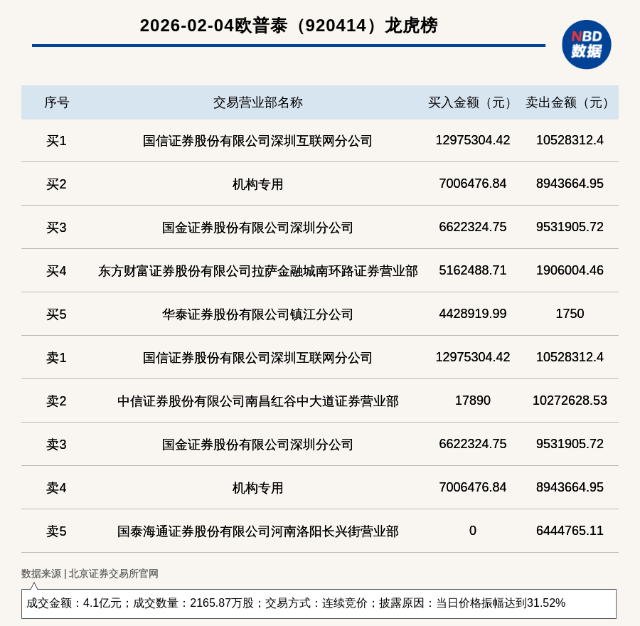 (记者 曾健辉) 免责声明:本文内容与数据仅供参考,不构成投资建议,使用前核实。据此操作,风险自担。 每日经济新闻 | | 2026-02-04欧普泰 (920414) 龙虎榜 | | | | --- | --- | --- | --- | | 序号 | 交易营业部名称 | 买入金额(元) | 卖出金额(元) | | न्द्र ग | 国信证券股份有限公司深圳互联网分公司 | 12975304 42 | 10528312.4 | | 买2 | 机构专用 | 7006476.84 | 8943664.95 | | 买3 | 国金证券股份有限公司深圳分公司 | 6622324.75 | 9531905.72 | | द्र 4 | 东方财富证券股份有限公司拉萨金融城南环路证券营业部 | 5162488.71 | 1906004.46 | | | | 4428919.99 | 1750 | | 卖T | 国信证券股份有限公司深圳互联网分公司 | 12975304.42 | 10528312.4 | | 卖2 | 中信证券股份有限公司南昌红谷中大道证券营业部 | 17890 | 10272628.53 | | 卖3 ...