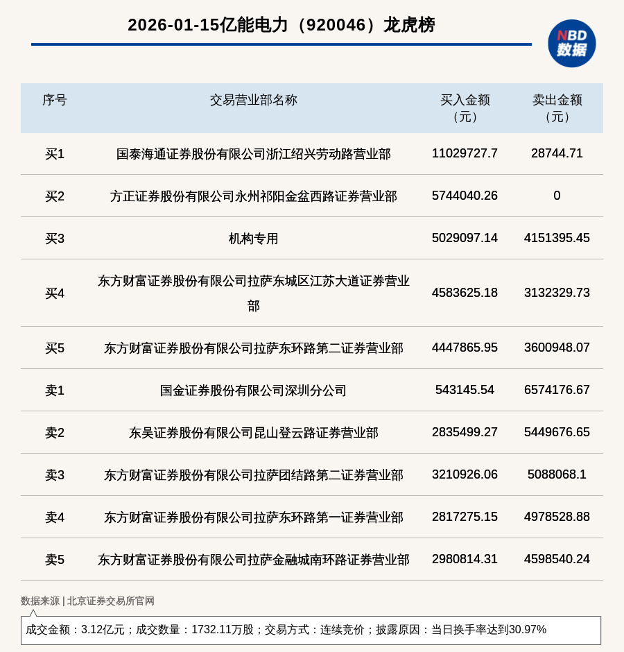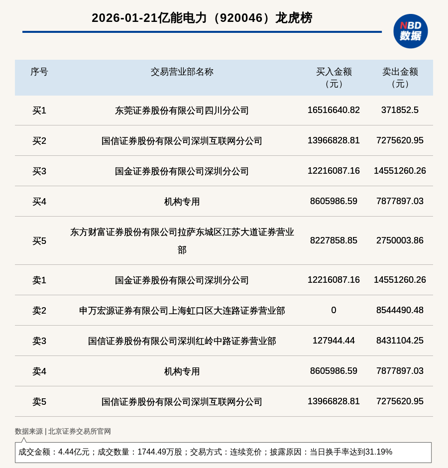 免责声明:本文内容与数据仅供参考,不构成投资建议,使用前核实。据此操作,风险自担。 每日经济新闻 (记者 曾健辉) 每经讯,2026年1月21日,北交所上市公司亿能电力(920046,收盘价:25.05元)登上龙虎榜,交易方式是连续竞价,披露原因 是当日换手率达到31.19%,成交数量1744.49万股,成交金额4.44亿元。买一席位为东莞证券股份有限公司四川分公司,买入 1651.66万元;卖一席位为国金证券股份有限公司深圳分公司,卖出1455.13万元。 | | 2026-01-21亿能电力 (920046) 龙虎榜 | | | | --- | --- | --- | --- | | 序号 | 交易营业部名称 | 买入金额 | 卖出金额 | | | | (元) | (元) | | ポリ | 东莞证券股份有限公司四川分公司 | 16516640.82 | 371852.5 | | 买2 | 国信证券股份有限公司深圳互联网分公司 | 13966828.81 | 7275620.95 | | 买3 | 国金证券股份有限公司深圳分公司 | 12216087.16 | 14551260.26 | | 买4 | 机构 ...