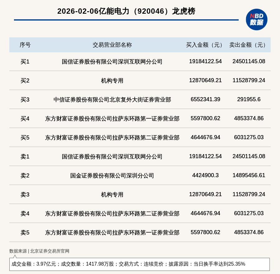 | | 2026-02-06亿能电力 (920046) 龙虎榜 | | | | --- | --- | --- | --- | | 序号 | 交易营业部名称 | 买入金额(元) | 卖出金额(元) | | ਜੇਟ ਹ | 国信证券股份有限公司深圳互联网分公司 | 19184122.54 | 24501145.08 | | 买2 | 机构专用 | 12870649.21 | 11528799.24 | | 买3 | 中信证券股份有限公司北京复外大街证券营业部 | 6552341.39 | 291955.6 | | द्र 4 | 东方财富证券股份有限公司拉萨东环路第一证券营业部 | 5597800.62 | 4853374.86 | | નેરિટ | 东方财富证券股份有限公司拉萨东环路第二证券营业部 | 4644676.94 | 6031275.03 | | 卖T | 国信证券股份有限公司深圳互联网分公司 | 19184122.54 | 24501145.08 | | 卖2 | 国金证券股份有限公司深圳分公司 | 4424900.3 | 14895456.61 | | 卖3 | 机构专用 | 12870649 ...
