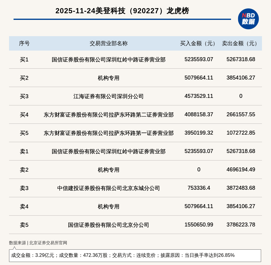 (记者 曾健辉) 每经讯,2025年11月24日,北交所上市公司美登科技(920227,收盘价:70.55元)登上龙虎榜,交易方式是连续竞价,披露原 因是当日换手率达到26.85%,成交数量472.36万股,成交金额3.29亿元。买一席位为国信证券股份有限公司深圳红岭中路证券营 业部,买入523.56万元;卖一席位为国信证券股份有限公司深圳红岭中路证券营业部,卖出526.73万元。 | | 2025-11-24美登科技 (920227) 龙虎榜 | | | | --- | --- | --- | --- | | 序号 | 交易营业部名称 | 买入金额(元) | 卖出金额(元) | | नेट ग | 国信证券股份有限公司深圳红岭中路证券营业部 | 5235593.07 | 5267318.68 | | 买2 | 机构专用 | 5079664.11 | 3854106.27 | | ग्रें३ | 江海证券有限公司深圳分公司 | 4573529.11 | 0 | | 买4 | 东方财富证券股份有限公司拉萨东环路第二证券营业部 | 4088158.37 | 2661557.55 | | ન્નેર | 东方财富 ...