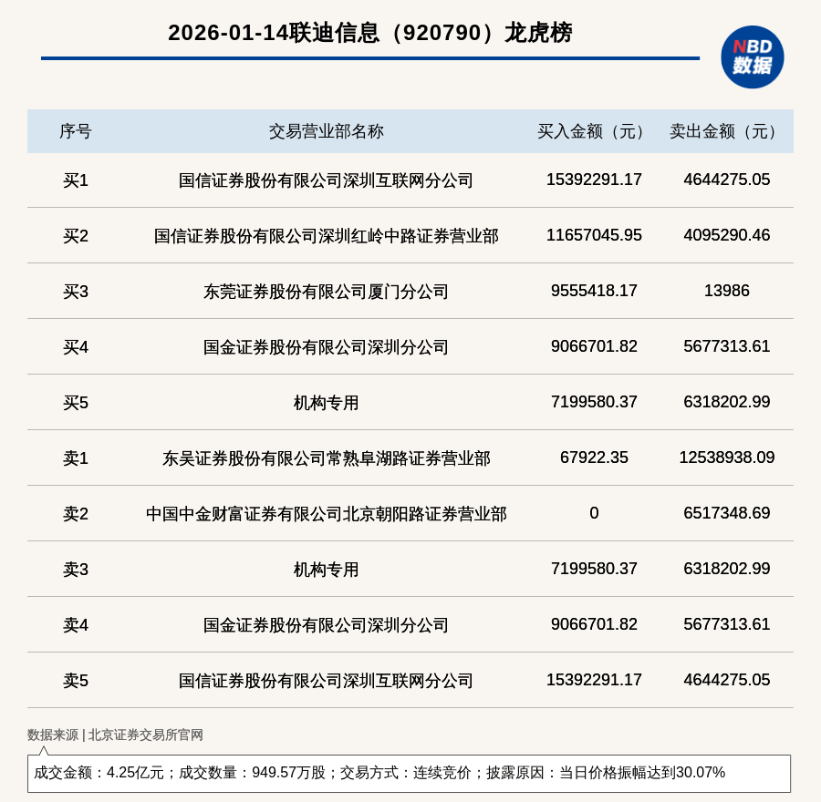 Group 1 - The stock of 联迪信息 (920790) increased by 13.48% with a trading volume of 4.25 billion yuan and a turnover rate of 17.47% [1] - The stock was listed on the 北交所 due to a price fluctuation of 30.07%, with institutional net purchases amounting to 881,400 yuan [2] - The top five trading departments had a total transaction volume of 92.74 million yuan, with net purchases of 13.13 million yuan [2] Group 2 - The specific trading details show that the top buying department was 国信证券股份有限公司深圳互联网分公司 with a purchase amount of 15.39 million yuan [2] - The institutional specialized seat had a net purchase of 881,400 yuan, with a buying amount of 7.19 million yuan and a selling amount of 6.32 million yuan [2] - The overall market activity indicates significant interest in the stock, as evidenced by the high turnover rate and substantial net buying from institutional investors [1][2]