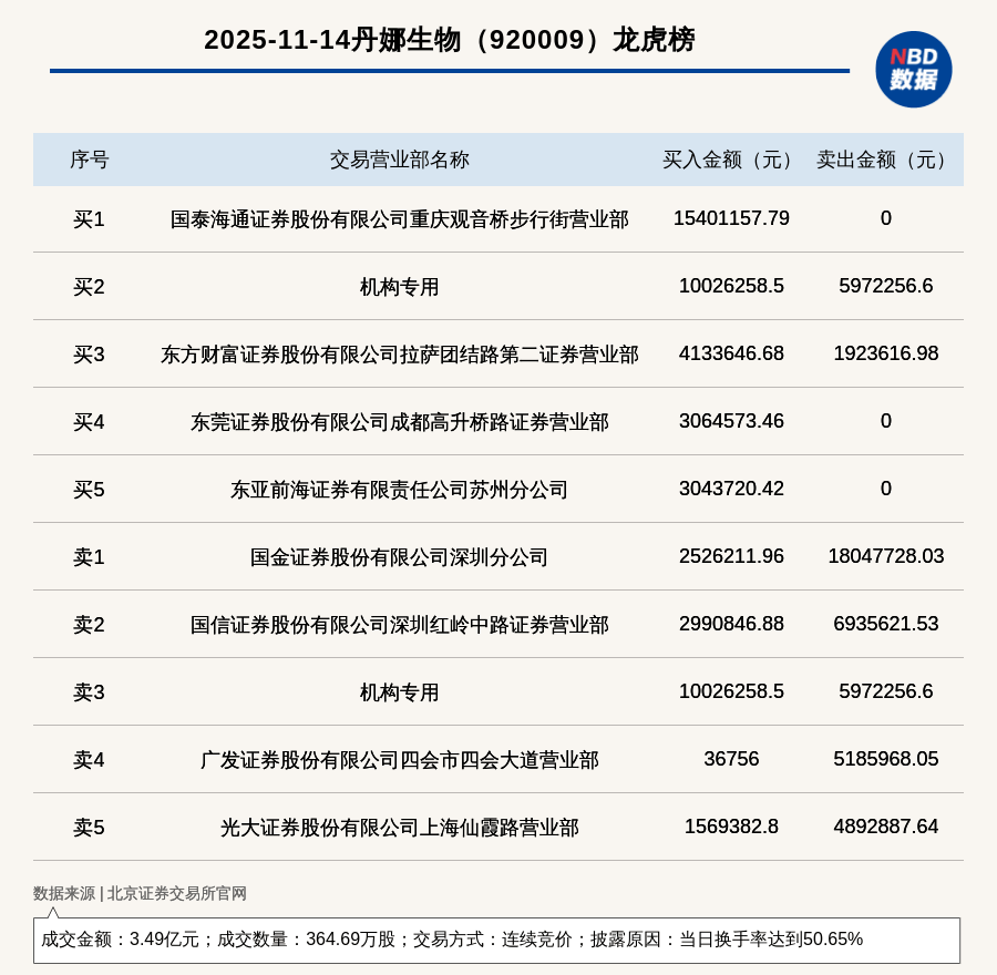 Core Insights - Dana Biological, listed on the Beijing Stock Exchange, experienced a significant trading event on November 14, 2025, with a turnover rate of 50.65% and a trading volume of 3.6469 million shares, amounting to a transaction value of 349 million yuan [1][2]. Trading Activity - The top buying entity was Guotai Junan Securities Co., Ltd., Chongqing Guanyinqiao Walking Street branch, purchasing shares worth approximately 15.4 million yuan [1][2]. - The leading selling entity was Guojin Securities Co., Ltd., Shenzhen branch, selling shares valued at around 18.05 million yuan [1][2]. - Other notable buying and selling activities included various securities firms, with significant amounts traded by institutional investors [2].