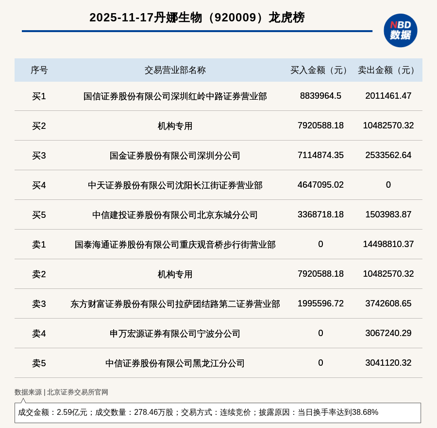 机构席位卖出1048.26万 北交所上市公司丹娜生物登龙虎榜