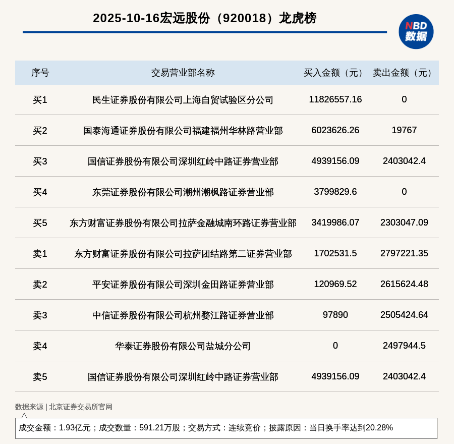 Core Insights - Hongyuan Co., Ltd. (stock code: 920018) experienced significant trading activity on October 16, 2025, with a turnover rate of 20.28% and a trading volume of 5.9121 million shares, amounting to a total transaction value of 193 million yuan [1][2]. Trading Activity Summary - The top buying entity was Minsheng Securities Co., Ltd. Shanghai Free Trade Zone Branch, purchasing shares worth approximately 11.83 million yuan [1][2]. - The leading selling entity was Dongfang Caifu Securities Co., Ltd. Lhasa Tuanjie Road Second Securities Business Department, selling shares valued at around 2.80 million yuan [1][2]. - Other notable buying and selling activities included purchases from Guotai Junan Securities Co., Ltd. and sales from various branches of Dongfang Caifu Securities [2].