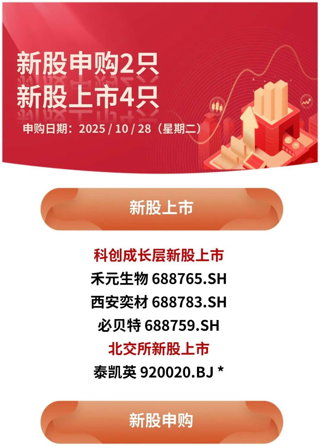 来源:市场资讯 (来源:国金证券第5小时) 新股申购2只 新股上市4只 申购日期:2025 / 10 / 28 (星期二) 新股上市 科创成长层新股上市 禾元生物 688765.SH 西安奕材 688783.SH 必贝特 688759.SH 北交所新股上市 泰凯英 920020.BJ * 新股申购 年十八 CO2002 CU / 中防公司 · 723000 | | | | 申购价格 | 所属行业 | 发行市盈率 | 行业最近一个月 平均静态市盈率 | | --- | --- | --- | --- | | 46.68元 | 通用设备 制造业 | 34.98倍 | 44.03倍 | | 可比公司 | | | | | 证券简称 | 市盈率(倍) | 市值(亿元) | 近一月涨跌 | | 中国动力 | 26.64 | 504.34 | 0.65% | | 大连重工 | 21.12 | 126.89 | 8.72% | 公司主营业务介绍 优势 公司主要从事高速重载精密齿轮传动产品的研发、生产与销 售,下游应用领域目前主要为风力发电机组,核心产品为风电 主齿轮箱。自2017年成立以来,公司深耕风力发电传动设备领 域,经 ...
