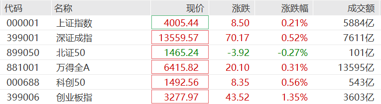 10月28日,A股早盘集体走强,迎来历史性时刻——上证指数盘中突破4000点整数关口,这是自2015年8月19日以来, 沪指时隔十年重回4000点之上。 截至午盘,沪指涨0.21%,报4005.44点,深成指涨0.52%,创业板指拉升涨1.35%。全场超3000股上涨,半日成交量 1.36万亿。 | 代码 | 名称 | 现价 | 涨跌 | 涨跌幅 | 成交额 | | --- | --- | --- | --- | --- | --- | | 000001 | 上证指数 | 4005.44 | 8.50 | 0.21% | 5884亿 | | 399001 | 深证成指 | 13559.57 | 70.17 | 0.52% | 7611亿 | | 899050 | 北证50 | 1465.24 | -3.92 | -0.27% | 101亿 | | 881001 | 万得全A | 6415.82 | 20.10 | 0.31% | 13595亿 | | 000688 | 科创50 | 1492.56 | 8.35 | 0.56% | 543亿 | | 399006 | 创业板指 | 3277.97 | 43.5 ...