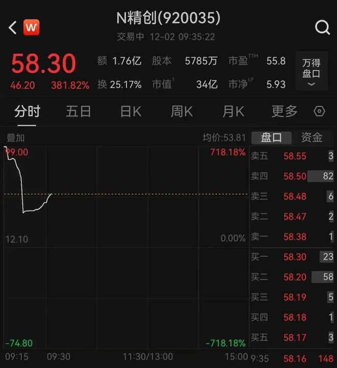 | < W | | N精创(920035) | | | | | | | --- | --- | --- | --- | --- | --- | --- | --- | | | | 交易中 12-02 09:35:22 | | | | | | | 58.30 | 额 1.76亿 | | 股本 5785万 市盈 " | | 55.8 | 万得 | | | 46.20 | 381.82% 换 25.17% 市值 | | 34亿 市净 | | 5.93 | 盘口 | | | 分时 | 五日 | 目K | 園K 月K | | 电影 | | | | 登加 | | | | 均价:53.81 | | 盘口 资金 | | | 99.00 | | | | 718.18% 卖五 | | 58.55 | 3 | | | | | | 32 74 | | 58.50 58.48 | 82 6 | | | | | | | | 58.47 | 2 | | 12.10 | | | | 0.00% 实- | | 58.38 | 1 | | | | | | | | 58.30 | 23 | | | | | | | | 58.20 | 58 | | ...