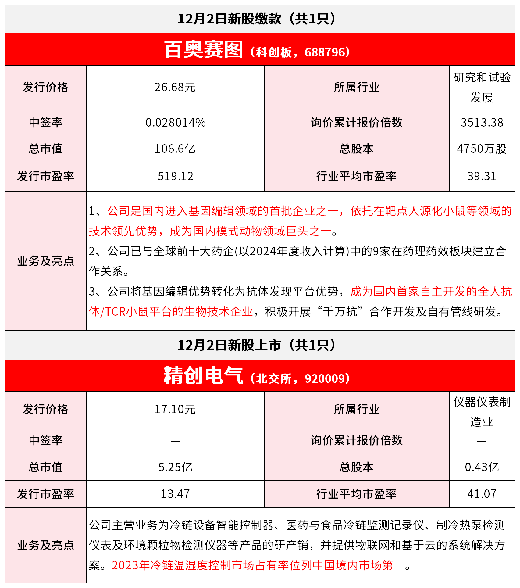 | | 精创电气(北交所, 92000 | | | --- | --- | --- | | 发行价格 | 17.10元 | | | 中签率 | | 询价 | | 总市值 | 5.25亿 | | | 发行市盈率 | 13.47 | 行业 | | --- | --- | --- | | | 仪表及环境颗粒物检测仪器等产品的研产销,并 | | | | 案。2023年冷链温湿度控制市场占有率位列中国 | | | 业务及亮点 | | | | | 公司主营业务为冷链设备智能控制器、医药与食、 | | *免责声明:文章内容仅供参考,不构成投资建议 *风险提示:股市有风险,入市需谨慎 12月2日新股缴款(共1只) E澳赛图(科创板,68879 | 发行价格 | 26.68元 | | | --- | --- | --- | | 智签率 | 0.028014% | 询价 | | 总市值 | 106.6亿 | | | 发行市盈率 | 519.12 | 行业 | | 业务及亮点 | 公司是国内进入基因编辑领域的首批企业之一 技术领先优势,成为国内模式动物领域巨头之一。 2、公司已与全球前十大药企(以2024年度收入计 | | | | ...