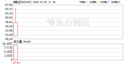 N精创(920035)今日在北交所上市,开盘价51.00元,上涨321.49%。 | 代码 | 简称 | 上市日期 | 发行价 | 网上申购获配比例 | 上市首日开盘价 | 上市首日开盘涨跌幅 | | --- | --- | --- | --- | --- | --- | --- | | | | | (元) | (%) | (元) | (%) | | 920035 | N精创 | 2025.12.02 | 12.10 | 0.02 | 51.00 | 321.49 | | 920124 | 南特科 技 | 2025.11.27 | 8.66 | 0.03 | 25.51 | 194.57 | | 920091 | 大鹏工 业 | 2025.11.21 | 9.00 | 0.02 | 35.09 | 289.89 | | 920160 | 北矿检 测 | 2025.11.18 | 6.70 | 0.02 | 30.88 | 360.90 | | 920003 | 中诚咨 询 | 2025.11.07 | 14.27 | 0.03 | 42.00 | 194.32 | | 920009 | 丹娜生 物 | 202 ...