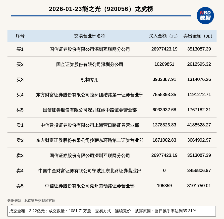 每经讯,2026年1月23日,北交所上市公司能之光(920056,收盘价:30.45元)登上龙虎榜,交易方式是连续竞价,披露原因是 当日换手率达到35.31%,成交数量1081.71万股,成交金额3.22亿元。买一席位为国信证券股份有限公司深圳互联网分公司,买 入2697.74万元;卖一席位为中信建投证券股份有限公司上海营口路证券营业部,卖出418.85万元。 (记者 曾健辉) | | 2026-01-23能之光 (920056) 龙虎榜 | | | | --- | --- | --- | --- | | 序号 | 交易营业部名称 | 买入金额(元) | 卖出金额(元) | | ਜੇਵ ਹ | 国信证券股份有限公司深圳互联网分公司 | 26977423.19 | 3513087.39 | | 买2 | 国金证券股份有限公司深圳分公司 | 10269851 | 2612595.32 | | 买3 | 机构专用 | 8983887.91 | 1314076.26 | | ग्रेडर | 东方财富证券股份有限公司拉萨团结路第一证券营业部 | 7558393.35 | 1191272.71 | | નેર | 国信 ...