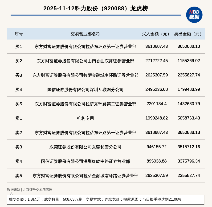 每经讯,2025年11月12日,北交所上市公司科力股份(920088,收盘价:35.1元)登上龙虎榜,交易方式是连续竞价,披露原因 是当日换手率达到21.06%,成交数量508.63万股,成交金额1.8亿元。买一席位为东方财富证券股份有限公司拉萨东环路第一证 券营业部,买入361.87万元;卖一席位为机构专用,卖出505.88万元。 | | 2025-11-12科力股份 (920088) 龙虎榜 | | | | --- | --- | --- | --- | | 序号 | 交易营业部名称 | 买入金额(元) | 卖出金额(元) | | नेट ग | 东方财富证券股份有限公司拉萨东环路第一证券营业部 | 3618687 43 | 3650888.18 | | 乐2 | 东方财富证券股份有限公司山南香曲东路证券营业部 | 2712722.45 | 1155369.02 | | 买3 | 东方财富证券股份有限公司拉萨金融城南环路证券营业部 | 2625307 59 | 2355827.74 | | नेट प | 国信证券股份有限公司深圳互联网分公司 | 2495236.08 | 1799483.99 | | ન ...