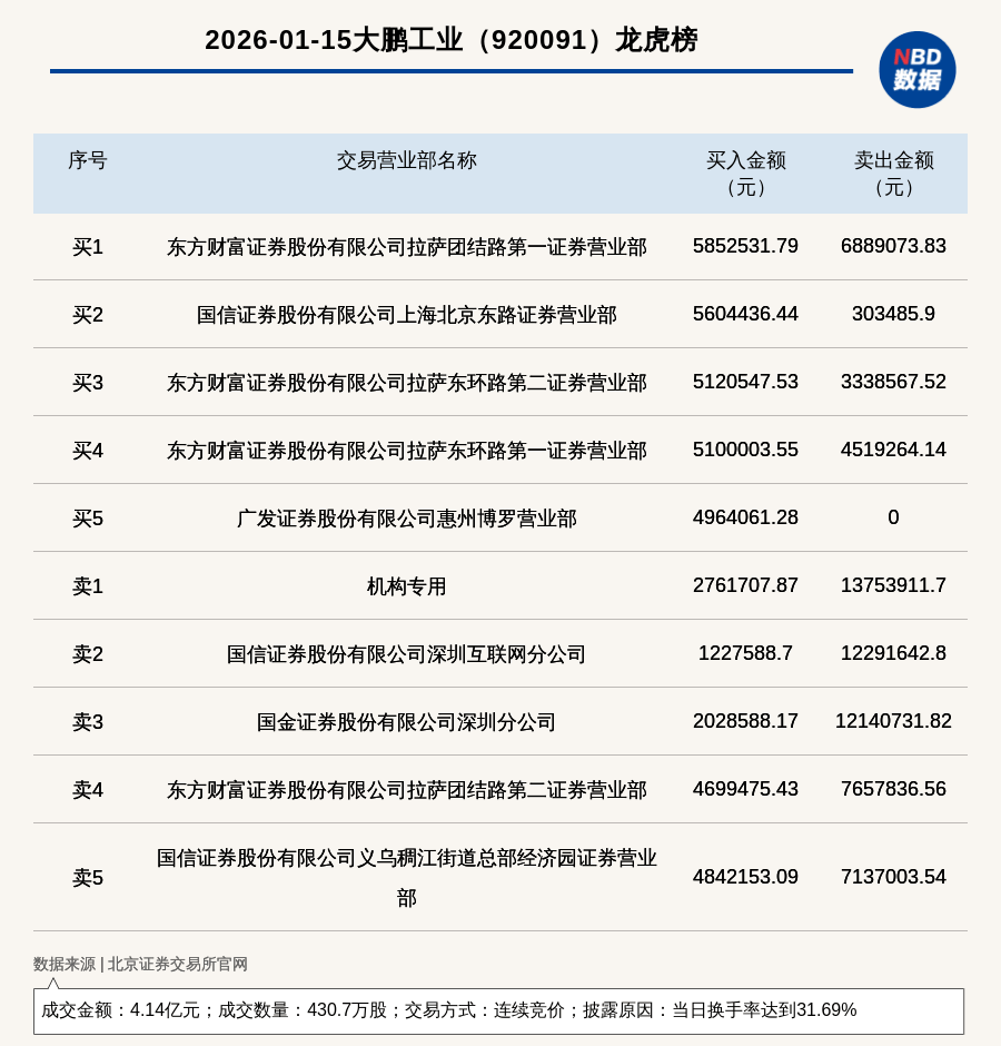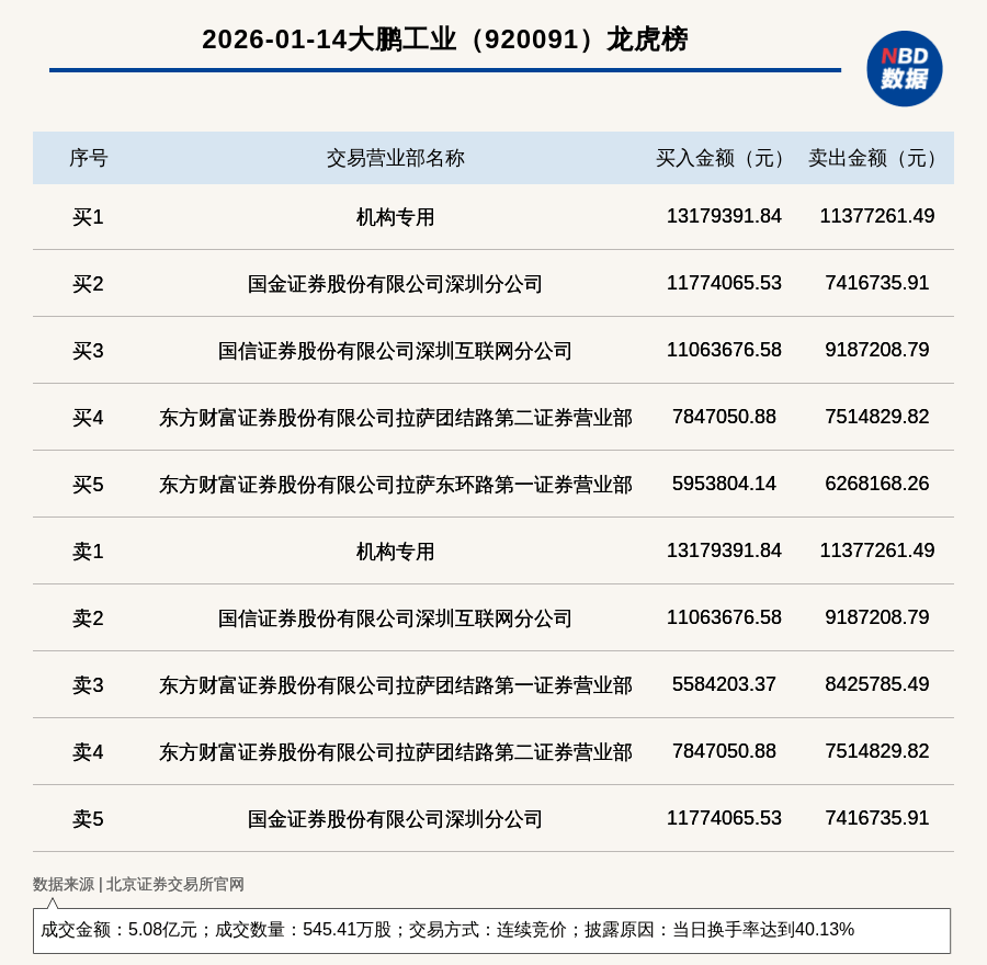 Group 1 - Dapeng Industrial (stock code: 920091) was listed on the Longhu list on January 14, 2026, due to a turnover rate of 40.13% and a trading volume of 5.4541 million shares, amounting to a transaction value of 508 million yuan [1][2] - The top buying position was from an institutional account, purchasing 13.18 million yuan, while the top selling position was also from an institutional account, selling 11.38 million yuan [1][2] - The trading activity indicates significant interest from institutional investors, with multiple firms participating in both buying and selling [2]