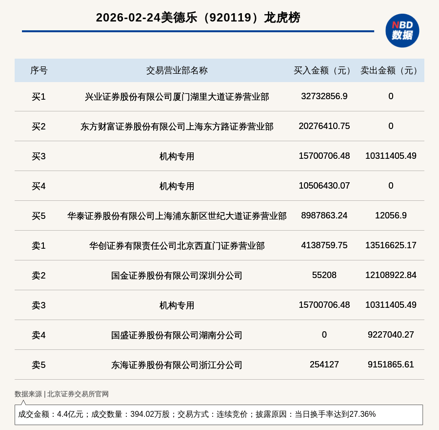 每经讯,2026年2月24日,北交所上市公司美德乐(920119,收盘价:108.7元)登上龙虎榜,交易方式是连续竞价,披露原因是 当日换手率达到27.36%,成交数量394.02万股,成交金额4.4亿元。买一席位为兴业证券股份有限公司厦门湖里大道证券营业 部,买入3273.29万元;卖一席位为华创证券有限责任公司北京西直门证券营业部,卖出1351.66万元。 (记者 曾健辉) 免责声明:本文内容与数据仅供参考,不构成投资建议,使用前核实。据此操作,风险自担。 每日经济新闻 | | 2026-02-24美德乐 (920119) 龙虎榜 | | | | --- | --- | --- | --- | | 序号 | 交易营业部名称 | 买入金额(元) | 卖出金额(元) | | न्द्र ग | 兴业证券股份有限公司厦门湖里大道证券营业部 | 32732856.9 | O | | 买2 | 东方财富证券股份有限公司上海东方路证券营业部 | 20276410.75 | 0 | | 买3 | 机构专用 | 15700706.48 | 10311405.49 | | 买4 | 机构专用 | 10506430.07 | ...