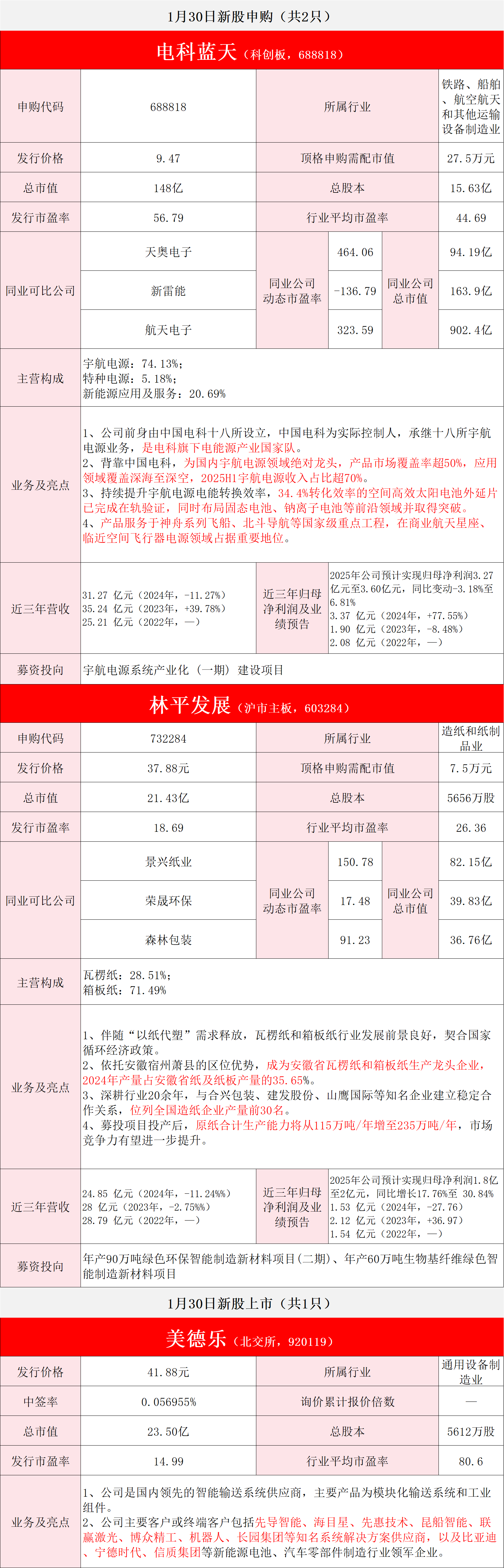 【1月30日IPO雷达】电科蓝天、林平发展申购;美德乐上市