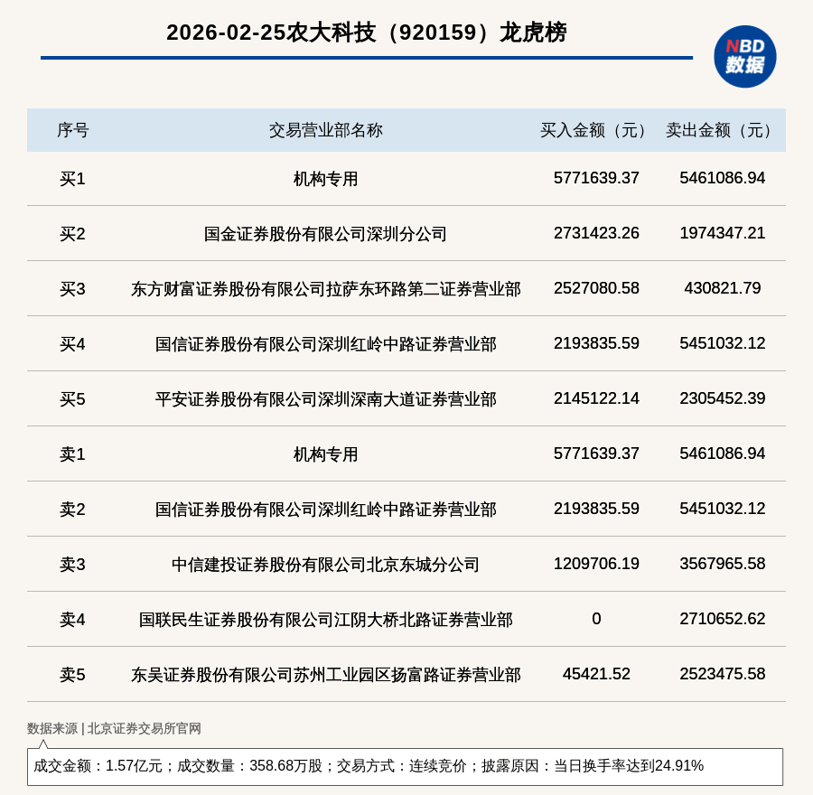 免责声明:本文内容与数据仅供参考,不构成投资建议,使用前核实。据此操作,风险自担。 每日经济新闻 (记者 曾健辉) 每经讯,2026年2月25日,北交所上市公司农大科技(920159,收盘价:42.99元)登上龙虎榜,交易方式是连续竞价,披露原因 是当日换手率达到24.91%,成交数量358.68万股,成交金额1.57亿元。买一席位为机构专用,买入577.16万元;卖一席位为机构 专用,卖出546.11万元。 | | 2026-02-25农大科技 (920159) 龙虎榜 | | | | --- | --- | --- | --- | | 序号 | 交易营业部名称 | 买入金额(元) | 卖出金额(元) | | ਜੇਟ ਹ | 机构专用 | 5771639.37 | 5461086.94 | | 买2 | 国金证券股份有限公司深圳分公司 | 2731423.26 | 1974347.21 | | 买3 | 东方财富证券股份有限公司拉萨东环路第二证券营业部 | 2527080.58 | 430821.79 | | 买4 | 国信证券股份有限公司深圳红岭中路证券营业部 | 2193835.59 | 5451032 ...