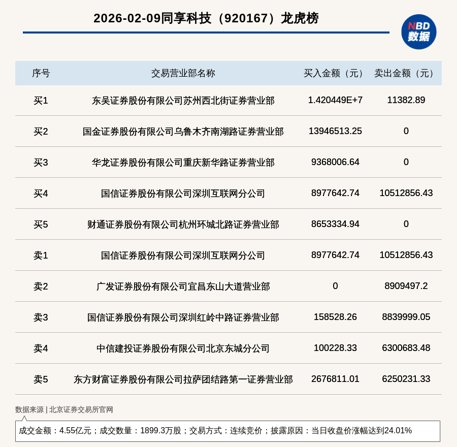 每经讯,2026年2月9日,北交所上市公司同享科技(920167,收盘价:24.07元)登上龙虎榜,交易方式是连续竞价,披露原因 是当日收盘价涨幅达到24.01%,成交数量1899.3万股,成交金额4.55亿元。买一席位为东吴证券股份有限公司苏州西北街证券营 业部,买入1420.45万元;卖一席位为国信证券股份有限公司深圳互联网分公司,卖出1051.29万元。 | | 2026-02-09同享科技 (920167) 龙虎榜 | | | | --- | --- | --- | --- | | 序号 | 交易营业部名称 | 买入金额(元) | 卖出金额(元) | | ਜੇਵ ਹ | 东吴证券股份有限公司苏州西北街证券营业部 | 1.420449E+7 | 11382.89 | | ポン | 国金证券股份有限公司乌鲁木齐南湖路证券营业部 | 13946513.25 | 0 | | 买3 | 华龙证券股份有限公司重庆新华路证券营业部 | 9368006.64 | 0 | | 24 | 国信证券股份有限公司深圳互联网分公司 | 8977642.74 | 10512856.43 | | ન્નેર | 财通证券股份有限公 ...