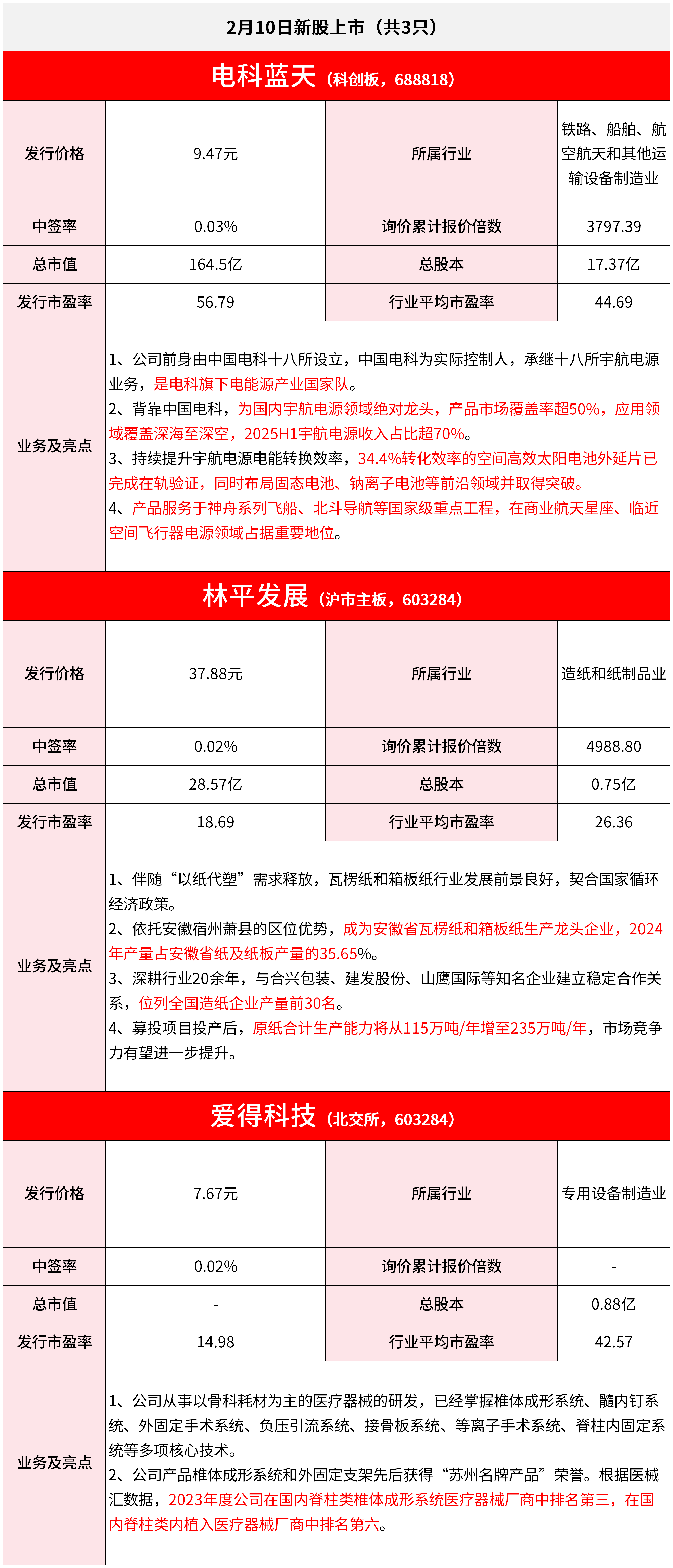 爱得科技主要从事以骨科耗材为主的医疗器械的研发、生产和销售,主要产品包括脊柱类、创伤类、运动医学等骨科医用耗材以及用于伤口疗愈的创面修复 产品。 公司2023-2025年营业收入分别为2.621亿元、2.749亿元、3.017亿元;净利润分别为6357万元、6713万元、7775万元。 智通财经2月10日讯,今日无新股申购;有3只新股上市,分别为沪市主板的林平发展,科创板的电科蓝天,北交所的爱得科技。 今日上市新股 林平发展是安徽省领先造纸企业,公司主要从事包装用瓦楞纸、箱板纸产品的研发、生产和销售。 公司2022-2024年分别实现营业收入28.79亿元/28.00亿元/24.85亿元;实现归母净利润1.54亿元/2.12亿元/1.53亿元。根据公司初步预测,公司2025年营业收入 较2024年增长6.23%至11.87%,归母净利润较2024年增长17.76%至30.84%。 电科蓝天是我国宇航电源领军者,公司主要产品包括空间太阳电池阵、空间锂离子电池组及电源控制系统等,服务于国家航天工程与商业航天领域,25H1 宇航电源业务收入占比74%。公司已成为国网星座、千帆星座等巨型星座的主力供应商。公司累计配套 ...