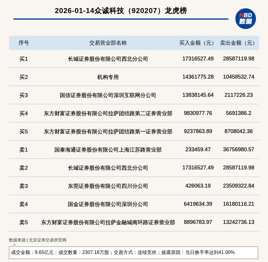 (记者 曾健辉) 每经讯,2026年1月13日,北交所上市公司众诚科技(920207,收盘价:42.37元)登上龙虎榜,交易方式是连续竞价,披露原因 是当日价格振幅达到31.90%,成交数量2576.04万股,成交金额12.68亿元。买一席位为东莞证券股份有限公司四川分公司,买入 2708.83万元;卖一席位为东方财富证券股份有限公司拉萨金融城南环路证券营业部,卖出1865.37万元。 | | 2026-01-13分诚科技 (920207) 龙虎榜 | | | | --- | --- | --- | --- | | 序号 | 交易营业部名称 | 买入金额(元) | 卖出金额(元) | | न्द्र ग | 东莞证券股份有限公司四川分公司 | 27088346.75 | 8661372.43 | | 址2 | 国金证券股份有限公司深圳分公司 | 19147608.23 | 13718026.64 | | 买3 | 东方财富证券股份有限公司拉萨金融城南环路证券营业部 | 17859372.91 | 18653660.09 | | नेटर | 国泰海通证券股份有限公司上海江苏路营业部 | 16572478.7 ...