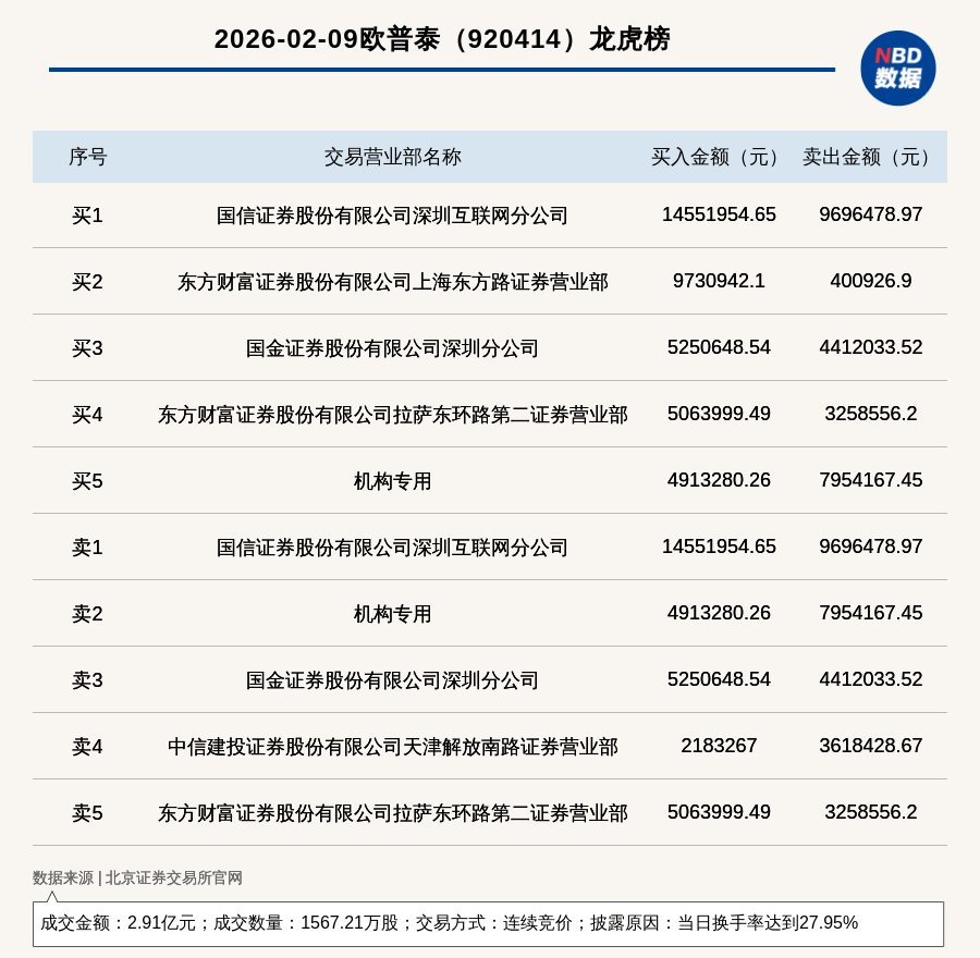 (记者 曾健辉) 免责声明:本文内容与数据仅供参考,不构成投资建议,使用前核实。据此操作,风险自担。 每日经济新闻 每经讯,2026年2月6日,北交所上市公司欧普泰(920414,收盘价:17.28元)登上龙虎榜,交易方式是连续竞价,披露原因是 当日换手率达到24.45%,成交数量1371.08万股,成交金额2.39亿元。买一席位为机构专用,买入753.13万元;卖一席位为国信 证券股份有限公司深圳互联网分公司,卖出3215.49万元。 | | 2026-02-06欧普泰 (920414) 龙虎榜 | | | | --- | --- | --- | --- | | 序号 | 交易营业部名称 | 买入金额(元) | 卖出金额(元) | | ポリ | 机构专用 | 7531265.11 | 5389472.08 | | 址2 | 国金证券股份有限公司深圳分公司 | 3822026.09 | 8794619.74 | | 买3 | 中国银河证券股份有限公司台州黄岩委羽街证券营业部 | 2636849.92 | 0 | | 买4 | 中泰证券股份有限公司宁波北仑恒山路证券营业部 | 2632657.83 | 0 | ...