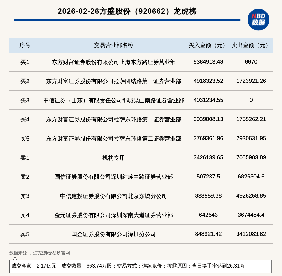 每经讯,2026年2月26日,北交所上市公司方盛股份(920662,收盘价:32.62元)登上龙虎榜,交易方式是连续竞价,披露原因 是当日换手率达到26.31%,成交数量663.74万股,成交金额2.17亿元。买一席位为东方财富证券股份有限公司上海东方路证券营 业部,买入538.49万元;卖一席位为机构专用,卖出708.6万元。 | | 2026-02-26方盛股份 (920662) 龙虎榜 | | | | --- | --- | --- | --- | | 序号 | 交易营业部名称 | 买入金额(元) | 卖出金额(元) | | ポリ | 东方财富证券股份有限公司上海东方路证券营业部 | 5384913.48 | 6670 | | 买2 | 东方财富证券股份有限公司拉萨团结路第一证券营业部 | 4918323.52 | 1723921.26 | | 址3 | 中信证券(山东)有限责任公司邹城泉山南路证券营业部 | 4031234 55 | 0 | | द्र 4 | 东方财富证券股份有限公司拉萨东环路第一证券营业部 | 3939008.13 | 1755262.21 | | ન્નેર | 东方财富证券股份 ...