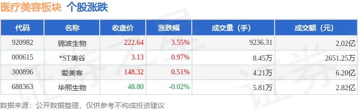 | 代码 | 名称 | 收盘价 | 涨跌幅 | 成交量(手) | 成交额(元) | | | --- | --- | --- | --- | --- | --- | --- | | 688363 | 华熙生物 | 47.18 | 5.24% | 11.82万 | | 5.62 亿 | | 300896 | 爱美客 | 141.14 | 1.01% | 4.75万 | | 6.83 亿 | | 000615 | *ST美谷 | 3.08 | 0.33% | 11.51万 | | 3595.71万 | | 920982 | 锦波生物 | 214.89 | -2.94% | 9949.16 | | 2.17亿 | 从资金流向上来看,当日医疗美容板块主力资金净流入1.0亿元,游资资金净流出4045.64万元,散户资金 净流出5989.44万元。医疗美容板块个股资金流向见下表: 证券之星消息,2月2日医疗美容板块较上一交易日上涨2.68%,华熙生物领涨。当日上证指数报收于 4015.75,下跌2.48%。深证成指报收于13824.35,下跌2.69%。医疗美容板块个股涨跌见下表: | 代码 | 名称 | 主力净流入 (元 ...