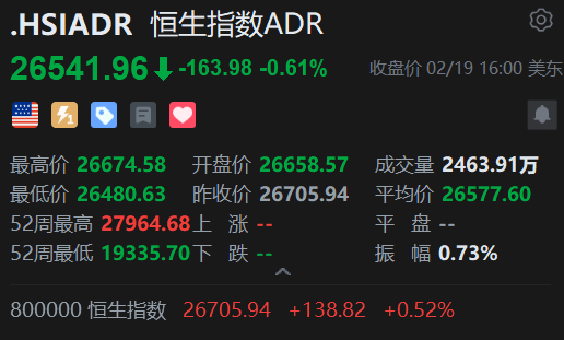| .HSIADR 恒生指数ADR | | | --- | --- | | 26541.96 ↓ -163.98 -0.61% | 收盘价 02/19 16:00 美东 | | 三月日同 ▼ | | | 最高价 26674.58 开盘价 26658.57 | 成交量 2463.91万 | | 最低价 26480.63 昨收价 26705.94 | 平均价 26577.60 | | 52周最高 27964.68上 涨 -- | 平 智 -- | | 52周最低 19335.70下 跌 -- | 振 幅 0.73% | | 800000 恒生指数 26705.94 +138.82 +0.52% | | | 序号 | 名称 | 港股代码 | 最新价 | 涨跌额 | 涨跌幅 | ADR代码 | ADR换算价(H | | --- | --- | --- | --- | --- | --- | --- | --- | | 1 | 腾讯控股 | 0 00700 | 533.000 | +1.000 | 0.19% | TCEHY | 532.3 | | 2 | 阿里巴巴-W | 09988 | 154.700 | -0.7 ...