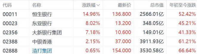 消息面上,恒生银行在港交所公告,汇丰亚太作为要约人,已要求恒生银行董事会向计划股东提呈建 议,根据公司条例第673条以协议安排方式将恒生银行私有化。 | 代码 | 名称 | 涨跌幅 √ | 最新价 | 总市值 | 年初至今涨跌 | | --- | --- | --- | --- | --- | --- | | 00011 | 恒生银行 | 14.96% | 136.800 | 2566.01亿 | 52.42% | | 00023 | 东亚银行 | 8.02% | 13.200 | 348.05亿 | 45.21% | | 02356 | 大新银行集团 | 7.18% | 10.600 | 149.01亿 | 41.33% | | 02388 | 中银香港 | 2.15% | 37.000 | 3911.93亿 | 61.21% | | 02888 | 渣打集团 | 0.65% | 154.000 | 3530.58亿 | 66.64% | 在恒生银行大涨的带动下,香港本地银行股集体上涨。其中,恒生银行涨近15%,东亚银行涨8%,大 新银行集团涨超7%,中银香港涨超2%。 ...