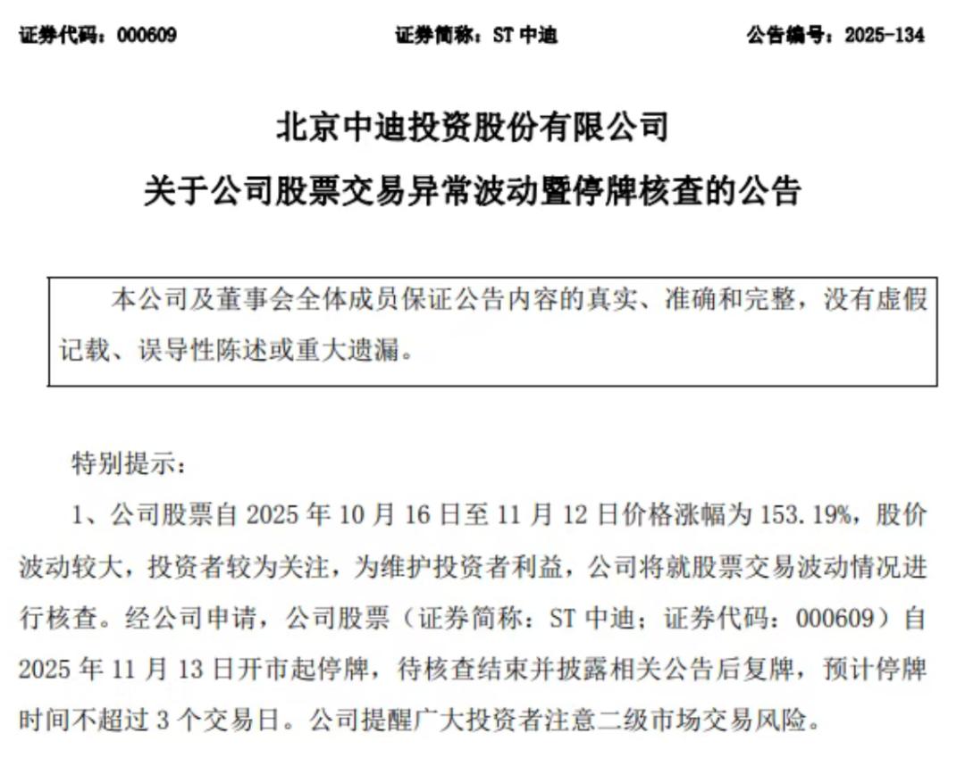 智通财经APP讯,ST中迪(000609.SZ)发布公告,公司股票自2025年10月16日至11月12日价格涨幅为 153.19%,股价波动较大,投资者较为关注,为维护投资者利益,公司将就股票交易波动情况进行核 查。经公司申请,公司股票自2025年11月13日开市起停牌,待核查结束并披露相关公告后复牌,预计停 牌时间不超过3个交易日。 ...