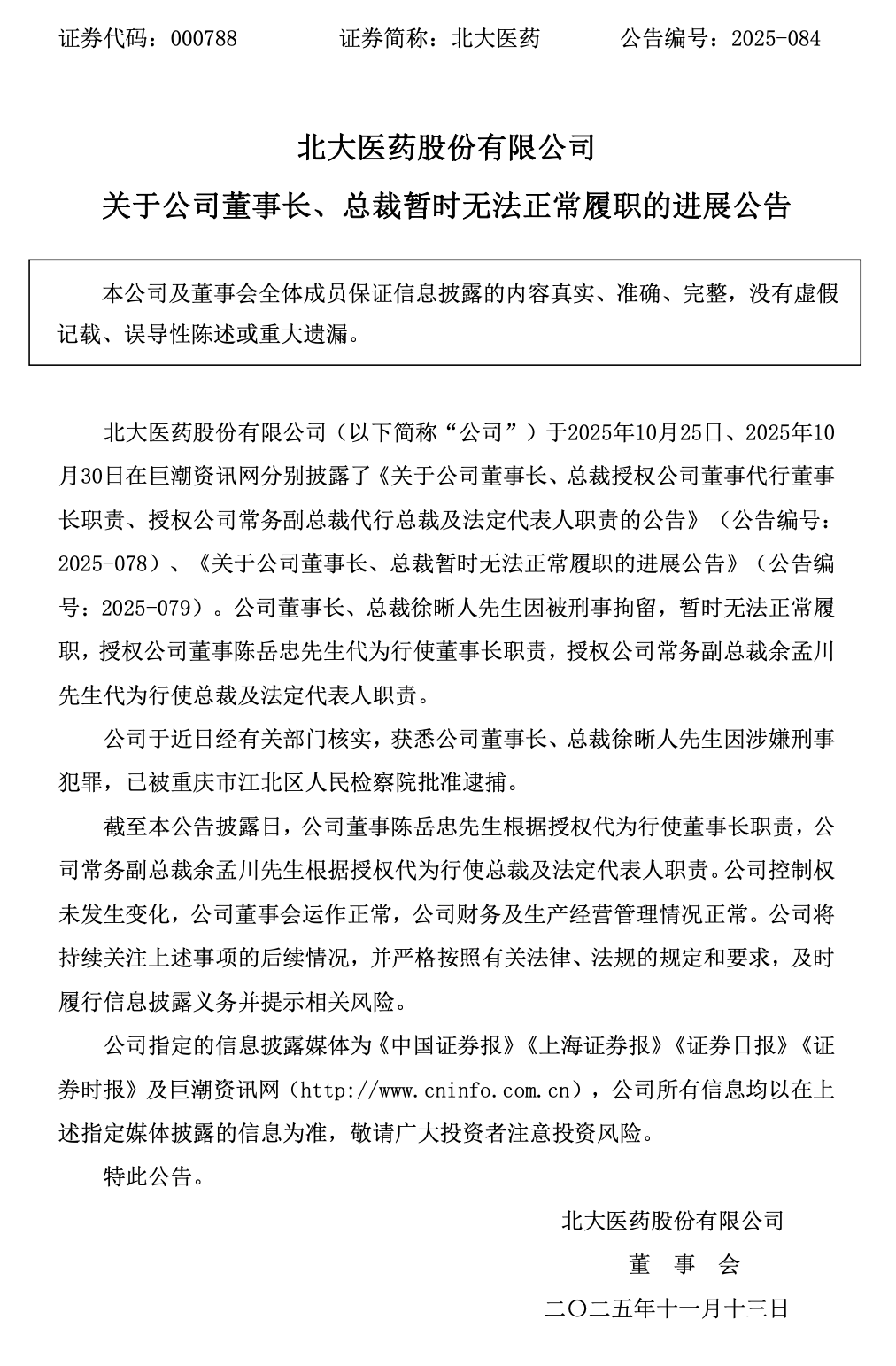 Core Viewpoint - The chairman and president of Beijing University Pharmaceutical (北大医药), Xu Xiren, has been criminally detained, affecting his ability to perform his duties, while the company's control and operations remain stable [2][6]. Group 1: Management Changes - Xu Xiren has temporarily delegated his responsibilities to board member Chen Yuezhong and executive vice president Yu Mengchuan due to personal reasons [5]. - The delegation of authority is effective from the date of the written authorization and will remain in effect until Xu Xiren provides written notice to terminate it [5]. Group 2: Company Operations - As of the announcement date, the company has stated that its control has not changed, the board is functioning normally, and its financial and operational management is stable [2][6]. - The company is currently unaware of the progress or conclusions of the investigation into Xu Xiren's detention [6]. Group 3: Financial Impact - Following Xu Xiren's leadership, the company has faced challenges, including the termination of a long-term service contract with Beijing University International Hospital, which is expected to reduce sales revenue by approximately 600 million yuan and net profit by about 40 million yuan in 2025 [7]. - The company anticipates a revenue decrease of approximately 1.027 billion yuan starting in 2026, which is about 49.85% of the 2024 revenue [7].
