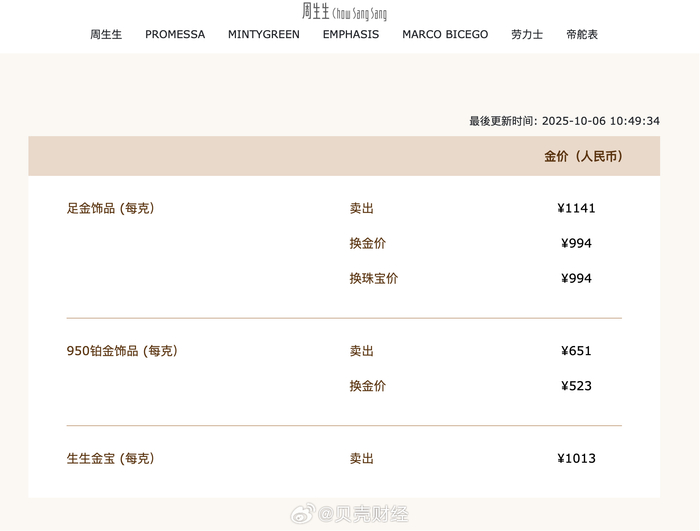 【#金饰克价涨至1141元#,#金饰每克价格一个月涨超70元#】10月6日,现货黄金继续走高,破3900美 元/盎司关口,并向上触及3920美元/盎司,再创历史新高。距离首次突破3800美元关口仅不到10天。 国内品牌金方面,多品牌首饰金报价升至1130元/克左右,周生生足金饰品标价达1141元/克,较前一月 (9月6日)1068元/克的价格上涨73元/克;老庙足金饰品价格报1138元/克,较前一月(9月6日)1062 元/克的价格上涨76元/克;周大福足金饰品价格报1139元/克,较前一月(9月6日)1060元/克的价格上 涨79元/克。#金价# @蓝鲸新闻 | | | 周生生 (how Sang Sang | | | | | --- | --- | --- | --- | --- | --- | | 周生生 PROMESSA | MINTYGREEN | EMPHASIS | MARCO BICEGO | 劳力士 | 帝舵表 | | | | | | | 最後更新时间: 2025-10-06 10:49:34 | | | | | | | 金价(人民币) | | 足金饰品(每克) | | 卖出 | | | ¥ ...