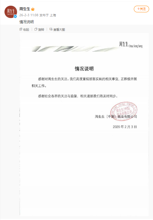 感谢社会各界的关注与监督,相关进展我们将及时同步。 对此,2月3日,周生生官方账号发布情况说明:我们高度重视顾客反映的相关事宜,正积极开展相关工 作。 ...