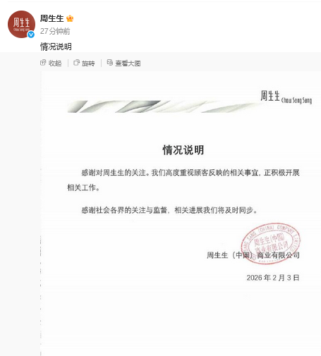 周生生回应“足金挂坠检出铁银钯”:高度重视,相关进展将及时同步