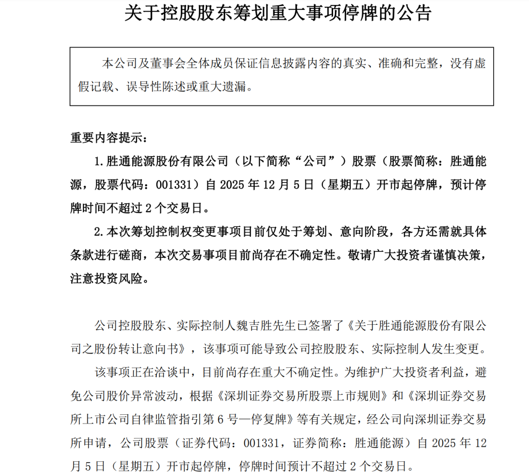 Core Viewpoint - After three years of being listed, Shengtong Energy (001331) plans to change its controlling shareholder and actual controller [1][2] Company Overview - Shengtong Energy was established in 2012 and went public on the Shenzhen Stock Exchange in September 2022, focusing on the procurement, transportation, and sales of LNG (liquefied natural gas), as well as transportation services for crude oil and general cargo [4] - As of the end of Q3 2025, the actual controller Wei Jisheng directly held 104 million shares, accounting for 36.97% of the company, with a market value of approximately 1.44 billion yuan [4] Shareholder Information - The top shareholders include Wei Jisheng (36.97%), Longkou Yunxuan Investment Center (9.89%), Longkou Tongyi Investment Center (7.54%), and others [5] - The company has experienced significant fluctuations in performance due to LNG market price volatility, with revenues of 5.157 billion yuan, 4.804 billion yuan, and 5.348 billion yuan from 2022 to 2024, and net profits of 172 million yuan, -39.546 million yuan, and -16.891 million yuan during the same period [5] Recent Performance - In the first three quarters of 2025, Shengtong Energy's performance showed recovery, with revenue increasing by 21.34% to 4.513 billion yuan and net profit rising by 83.58% to 44.394 million yuan [7] - The company sources LNG through domestic market pricing and a five-year long-term agreement known as the "import LNG window one-stop service," which is sensitive to market supply and demand [7] - On December 4, the day before the stock suspension, Shengtong Energy's stock surged by 8.06%, closing at 14.75 yuan per share, with a total market value of 4.163 billion yuan [7]