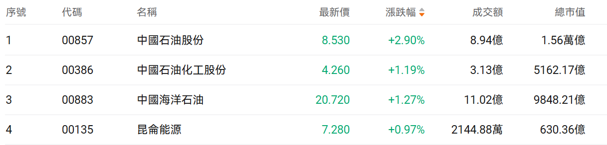 此外,里昂发表报告指,中石油第三季业绩显示,公司可在油市波动下交出稳定及坚韧的盈利。中石油股息展望及股息稳定性为同业中最佳。该行对中石油 H股目标价由8.6港元上调至8.8港元,A股目标价由11.9元上调至12元,重申"跑赢大市"评级,视为三桶油中首选。 消息面上,OPEC+周日表示,计划明年第一季度暂停增产,这是该组织自4月开始恢复之前削减的供应以来,首次按下增产暂停键。在OPEC宣布暂停增产 后,摩根士丹利上调对原油价格的短期预测,该行将2026年上半年布伦特原油期货价格预期从每桶57.50美元上调至60美元。 今日,港股石油股继续走高,截至发稿, 涨2.9%, 、 涨1%。 | 序號 | 代碼 | 名稱 | 最新價 | 漲跌幅 ◆ | 成交額 | | | --- | --- | --- | --- | --- | --- | --- | | 1 | 00857 | 中國石油股份 | 8.530 | +2.90% | 8.94億 | 1 | | 2 | 00386 | 中國石油化工股份 | 4.260 | +1.19% | 3.13億 | 51 | | 3 | 00883 | 中國海洋石油 | 20.72 ...