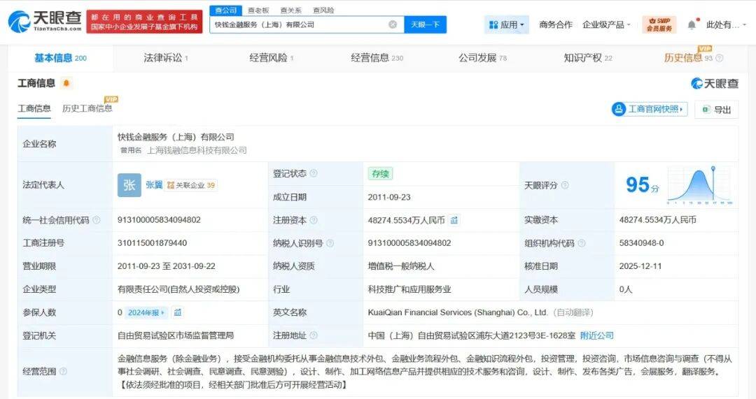 据媒体报道,今年7月,中国儒意公告称,间接全资附属公司上海儒意星辰拟2.4亿元收购快钱金融30%股权。交易完成后,中国儒意将成为快钱金融单一 最大股东,业务拓展至第三方支付及金融科技领域。 | | 色 No 都在用的植业青铜丁 原 | 商参版 商关系 畜风险 | | | | | | | --- | --- | --- | --- | --- | --- | --- | --- | | | | 快钱金融服务(上海)有限公司 | 3 天眼一下 | ■ 版用 ▼ | 商务合作 企业级产品 - | dins 4 会思随各 | ▲ 出处有 ... ▼ | | 基本信息 200 | 法律诉讼 1 | 经营风险: | 经营信息 230 | 公司发展 78 | 知识产权 22 | | 历史信息 93 7 | | 工商信息 # | | | | | | | 2天眼查 | | 工商信息 历史工商信息 | | | | | | 4 L簡目网快 | ■ 导出 | | 企业名称 | 快钱金融服务(上海)有限公司 ■用名 上海找融信息科技有限公司 | | | | | | | | | | 受记状态(2) | 存续 | | | | | | 法定 ...