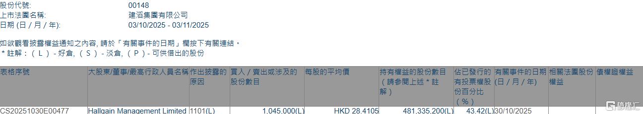 格隆汇11月3日丨根据联交所最新权益披露资料显示,2025年10月30日,建滔集团(00148.HK)获Hallgain Management Limited在场内以每股均价28.4105港元增 持104.5万股,涉资约2968.9万港元。 | 股份代號: | ON SECRETATION STA 00148 | | --- | --- | | 上市法國名稱: | 建滔集國有限公司 | | 日期 (日 / 月 / 年): | 03/10/2025 - 03/11/2025 | | 表格序號 | 大股東/董事/最高行政人員名稱作出披露的 買入 / 賣出或涉及的 每股的平均價 | | | 持有權益的股份數目 佔已發行的 有關事件的日期 | | | --- | --- | --- | --- | --- | --- | | | 原因 | 股份數目 | | (詩参関上述 * 註 | | | | | | | 份自分比 | | | | | | | 96 1 | | | CS20251030E00477 | Hallgain Management Limited (101(L) 1.045.000(L | | HKD 28 ...