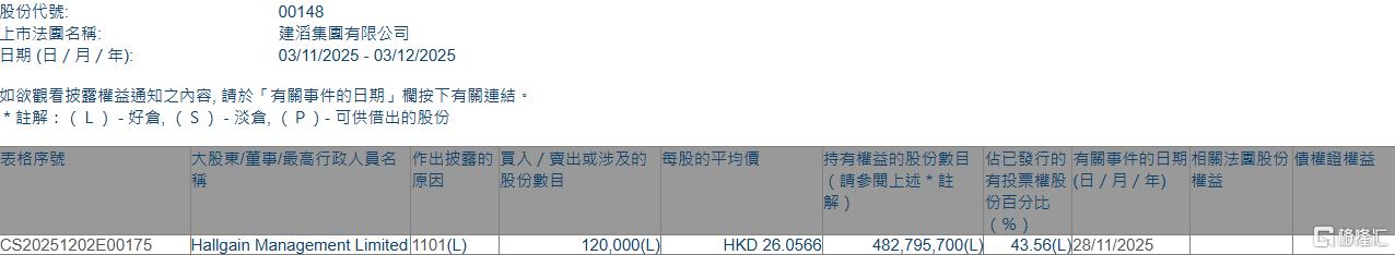 增持后,Hallgain Management Limited最新持股数目为482,995,700股,持股比例由43.56%上升至43.57%。 格隆汇12月18日丨根据联交所最新权益披露资料显示,2025年12月11日,建滔集团(00148.HK)获Hallgain Management Limited在场内以每股均价27.55港元增 持20万股,涉资约551万港元。 | 表格序號 | 大股東/董事/最高行政人員名 作出披露的 買入 / 賣出或涉及的 每股的平均價 | | | | 持有權益的股份數目 佔已發行的有關事件的日 相關法國 | | --- | --- | --- | --- | --- | --- | | | | 股份數目 | | | (苗多國上犹* 註 有投票權股期 (日 / 月 / 份權益 | | | | | | | 份百分比 年) | | | | | | | 96 | | CS20251216E00277 Hallgain Management | 1101(L) | | 200,000(L) | HKD 27.5500 | 482,995,700(L) 43.57(L)11/12/2025 ...