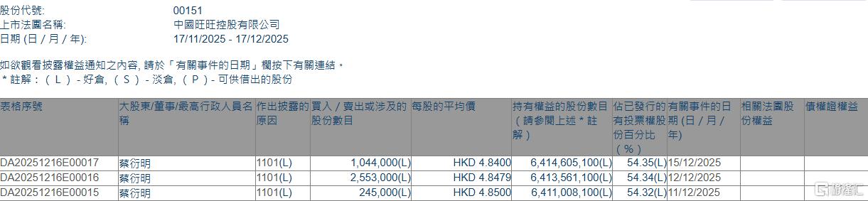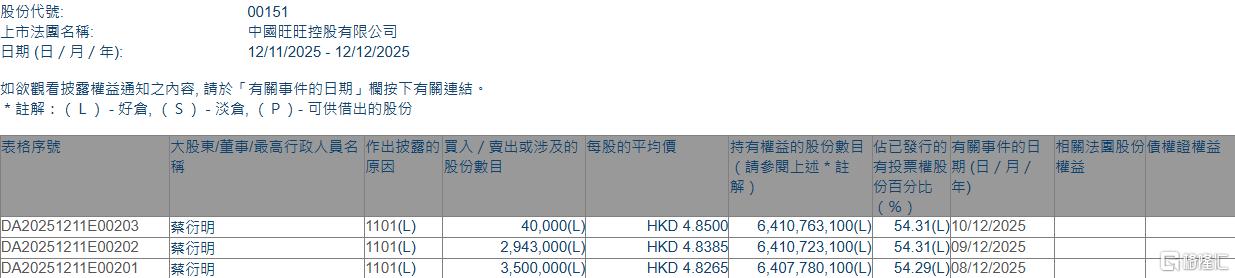 | 表格序號 | | 大股東/董事/最高行政人員名 作出披露的 買入 / 曹出或涉及的 每般的平均價 | | | | 持有權益的股份數目 佔已發行的 有關事件的日 相關法 | | --- | --- | --- | --- | --- | --- | --- | | | | 泉内 | 发分數目 | | 請參聞上述*註 | 有投票權股 期 (日 / 月 / | | | | | | 11 | | 份自分比 E | | DA20251211E00203 | 蔡衍明 | 1101(L) | 40,000(L) | HKD 4.8500 | 6,410,763,100(L) | 54.31(L)10/12/2025 | | DA20251211E00202 | 禁行明 | 1101(L) | 2,943,000(L) | HKD 4.8385 | 6,410,723,100(L) | 54.31(L)09/12/2025 | | DA20251211E00201 | 禁衍明 | 1101(L) | 3,500,000(L) | HKD 4.8265 | 6,407,780,100(L) | 54.29(L)08/12/ ...