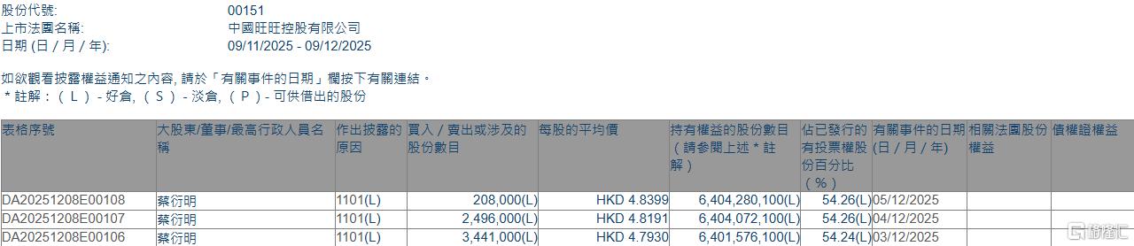 | 股份代號: | 00151 | | --- | --- | | 上市法國名稱: | 中國旺旺控股有限 | | 日期 (日 / 月 / 年): | 09/11/2025 - 09/1 | 格隆汇12月9日丨根据联交所最新权益披露资料显示,2025年12月3日-12月5日,中国旺旺(00151.HK)获执行董事蔡衍明在场内以每股均价4.793-4.8399港元 合计增持614.5万股,涉资约2952.8万港元。 增持后,蔡衍明最新持股数目为6,404,280,100股,持股比例由54.21%上升至54.26%。 | 寿格序號 | | 大股東/董事/最高行政人員名 作出披露的 冒入 / 曹出或涉及的 | | 每股的平均價 | | 持有權益的股份數目 佔已發行的 有關事件的日期 | | --- | --- | --- | --- | --- | --- | --- | | | | | 发'负载日 | | 謂發開上述 | 有投票權版(日/月/年) | | | | | | | | 份自分比 | | | | | | | | 96 | | DA20251208E00108 | 禁衍明 | 1101(L) | 208,00 ...