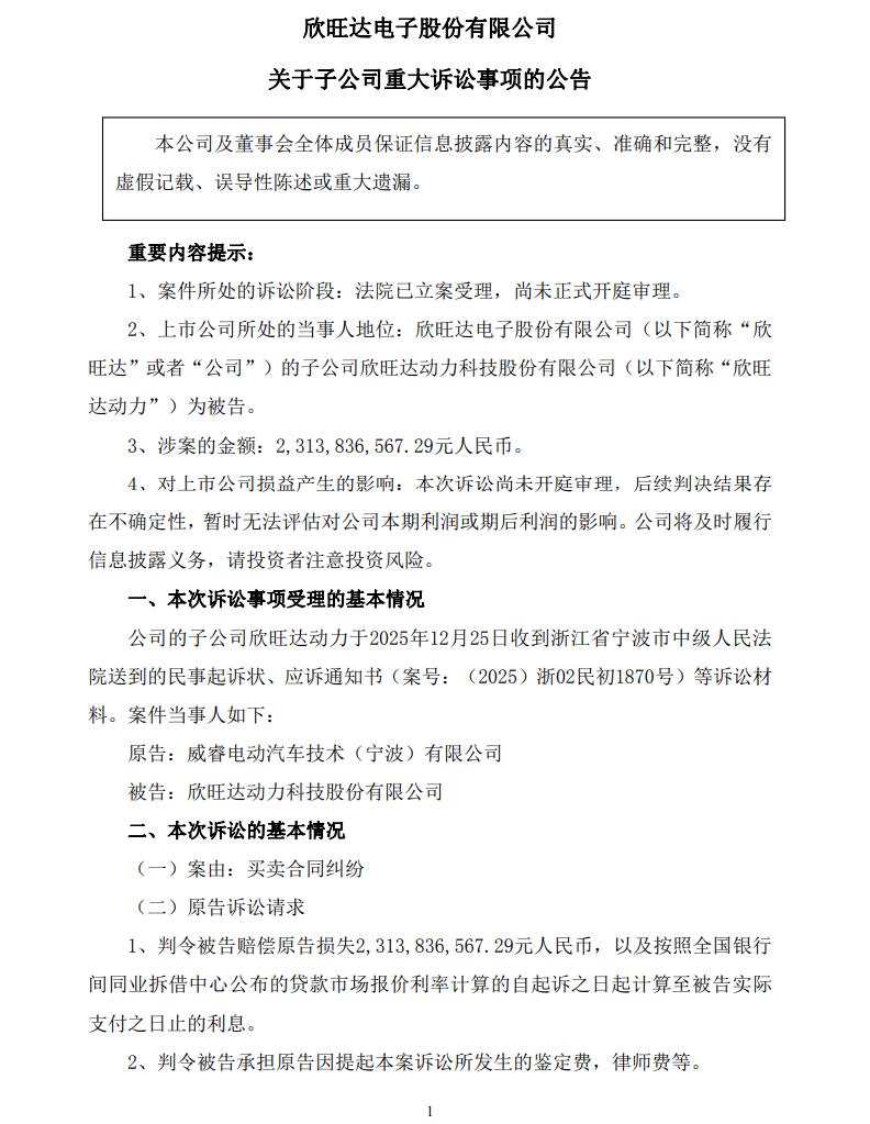 动力电池市场,突然炸了一颗雷! 近日,锂电池厂商欣旺达发布公告称,其子公司欣旺达动力,被吉利系公司威睿电动汽车技术(宁波)有限公司(以下简称"威睿")指控,被索赔23.14 亿元。受此消息影响,12月29日,欣旺达股价大跌11.39%,市值蒸发超60亿。 如今,吉利与欣旺达关系"破裂",并且这场吉利的"秋后算账",对欣旺达来说十分棘手。 欣旺达动力作为承载其动力电池业务的子公司,在2023年曾计划分拆至创业板上市,今年还准备通过整体赴港上市的途径,让欣旺达动力进入国际资本市 场。而在冲刺港交所的途中,被指出曾经存在质量硬伤,难受的不只是欣旺达,还有欣旺达供应的汽车主机厂。 电芯质量不过关,遭客户索赔23亿 动力电池供应商与主机厂之间的供应关系,理应相对稳定,但吉利这次选择掀桌子。 欣旺达与吉利的关系,是从亲密合作,转变到对簿公堂,也只用了不到五年。2021年,吉利方面与欣旺达动力合资成立山东吉利欣旺达,吉润汽车、欣旺 达和吉利汽车集团分别持有该公司41.5%、30%和28.5%的股份。 据悉,双方合作项目是计划建设年产能80万套混合动力电池,总投资50亿元。该项目于2022年年初开工建设,仅用了一年的时间,项 ...