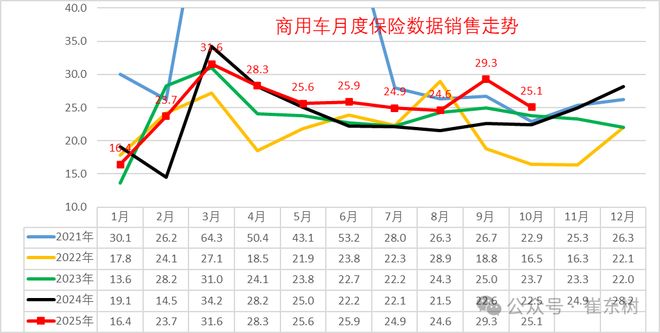 Core Viewpoint - The penetration rate of new energy commercial vehicles in China is projected to reach 33% by October 2025, an increase of 8 percentage points from 25% in October 2024, indicating strong growth in the sector driven by policy support and market demand [1][13]. New Energy Commercial Vehicle Penetration Rate - The penetration rate of new energy commercial vehicles has shown significant growth, reaching 27% in the first ten months of 2025, up from 20% in 2024 and 11% in 2023 [1][13]. - The penetration rates for trucks and buses are 24% and 72% respectively, both showing substantial increases compared to previous years [17]. Sales Performance - In October 2025, the domestic sales of new energy commercial vehicles reached 82,000 units, marking a year-on-year increase of 49% [2][11]. - From January to October 2025, total sales of commercial vehicles in China reached 2.55 million units, a 10% increase compared to the same period in 2024 [7][2]. Market Trends - The new energy commercial vehicle market has been characterized by strong growth, particularly from March to October 2025, with sales consistently at high levels [11][2]. - The overall commercial vehicle market has seen fluctuations, with a notable drop in January 2025 followed by a recovery in subsequent months [5][7]. Competitive Landscape - The commercial vehicle market is primarily supported by light truck manufacturers, with Foton and Wuling leading in sales [20][19]. - The heavy-duty truck segment has shown stability, with companies like FAW Jiefang and China National Heavy Duty Truck Group performing well [22][19]. Regional Market Dynamics - The eastern regions, particularly North China and South China, have shown strong performance in the light truck market, while the penetration of new energy heavy trucks is increasing in regions like Beijing-Tianjin-Hebei and Southwest China [21][23]. - The light passenger vehicle market is dominated by manufacturers such as Jiangling Motors and SAIC-GM-Wuling, with emerging players like Geely making significant strides in the new energy segment [27][29].