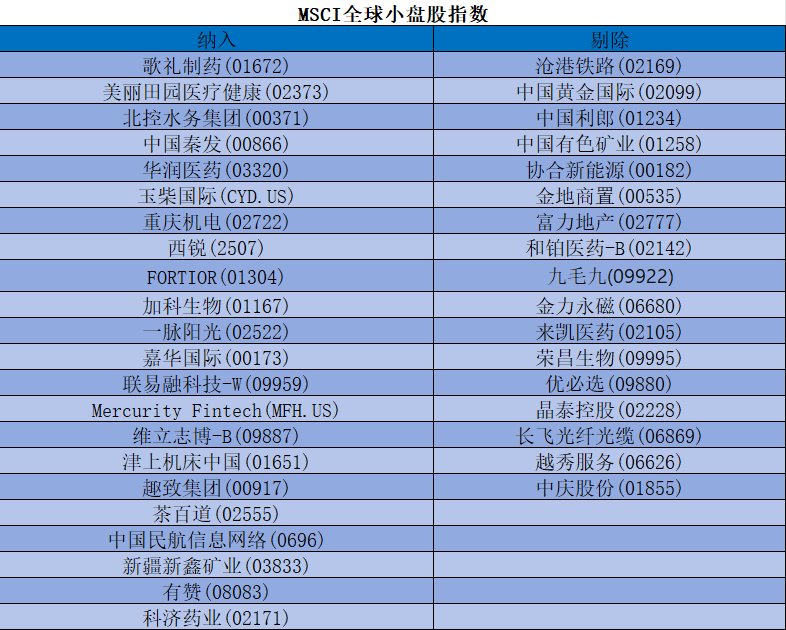 此外,MSCI香港指数纳入周生生(00116)、鹰君(00041)、美高梅中国(02282)等7只个股。同时剔除科济药业 (02171)、和记电讯香港(00215)。 | MSCI香港指数 | | | --- | --- | | 纳入 | 刷除 | | 周生生(00116) | 科济药业(02171) | | 京信通信(02342) | 和记电讯香港(00215) | | 鹰君(00041) | | | 佳鑫国际资源(03858) | | | 美高梅中国(02282) | | | Super X AI Technology (SUPX. US) | | | 和铂医药-B(02142) | | | MOUT土杯小mI以扣双 | | | --- | --- | | 纳入 | 刷除 | | 歌礼制药(01672) | 沧港铁路(02169) | | 美丽田园医疗健康(02373) | 中国黄金国际(02099) | | 北控水务集团(00371) | 中国利郎(01234) | | 中国秦发(00866) | 中国有色矿业(01258) | | 华润医药(03320) | 协合新能源(00182) | | 玉柴国际 ...