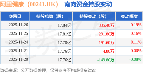 阿里健康(00241.HK):11月26日南向资金增持335.4万股
